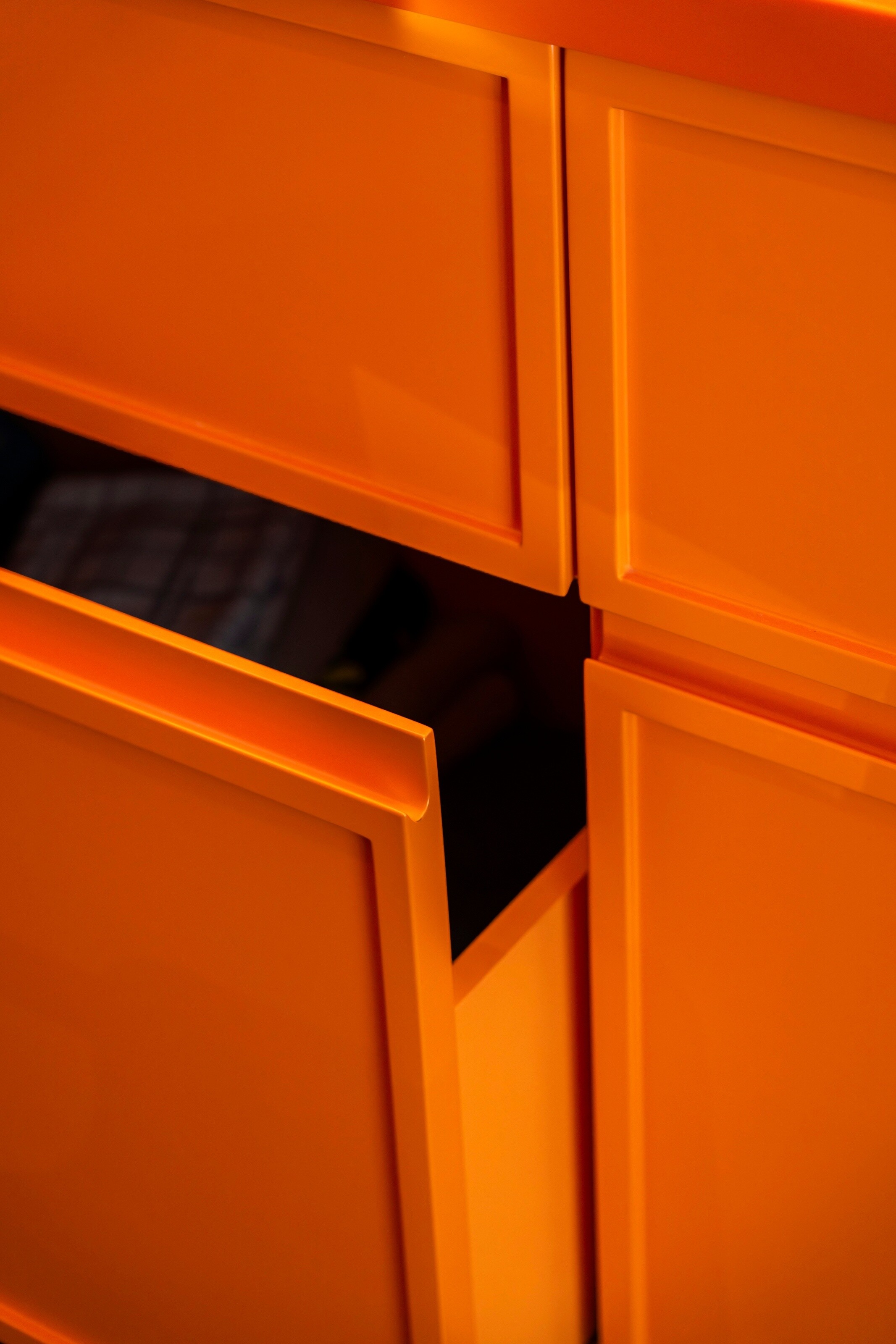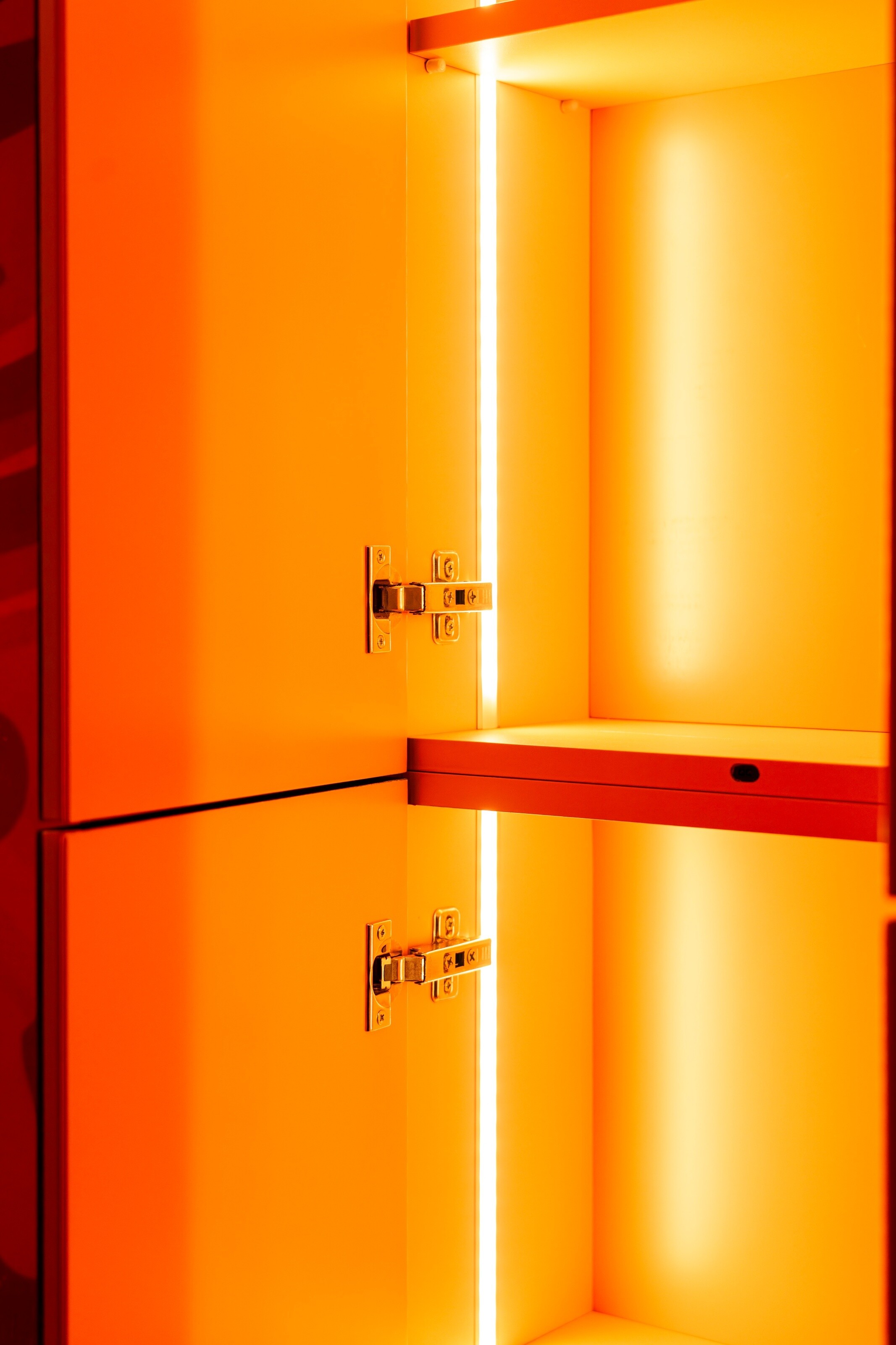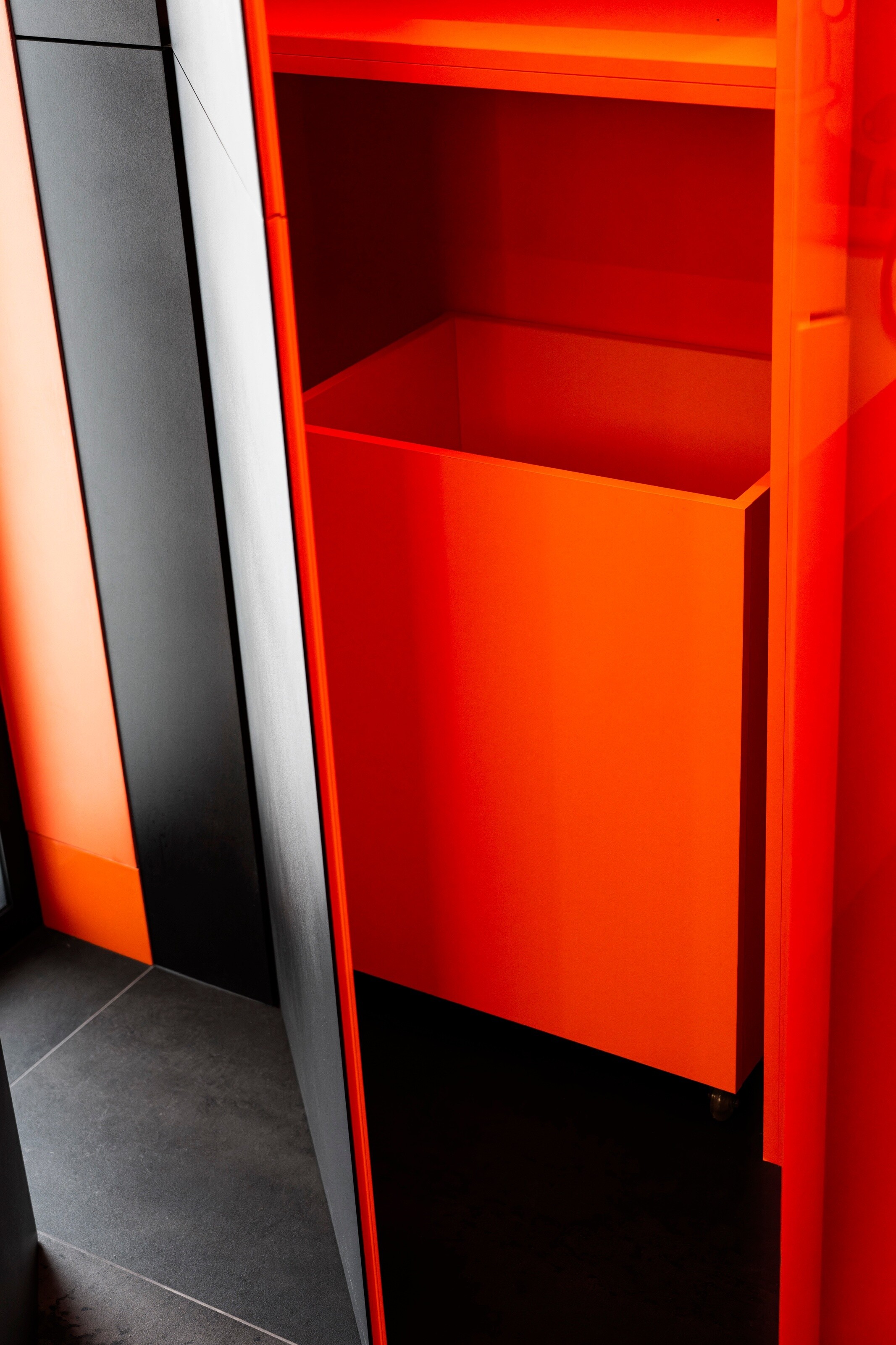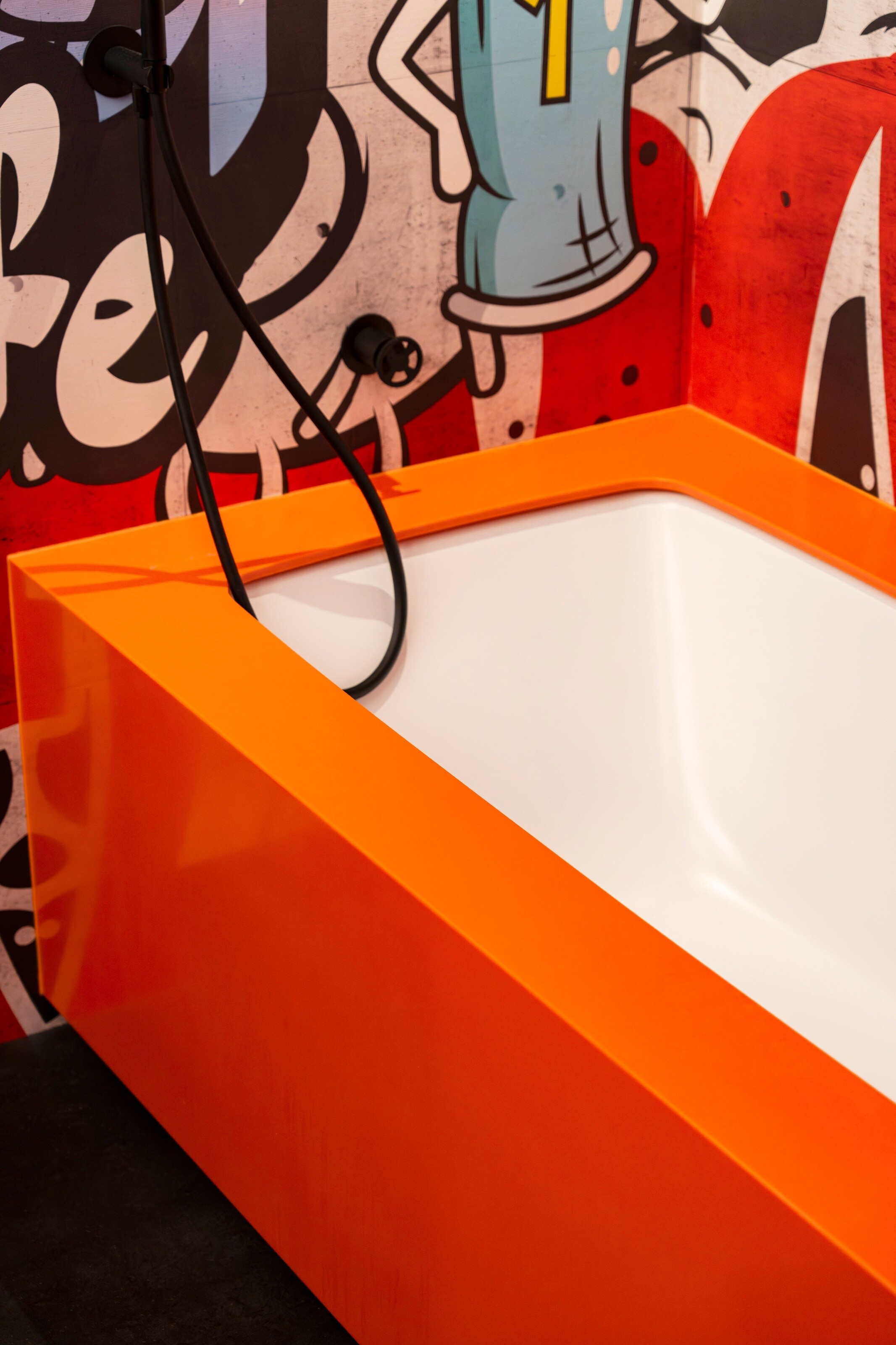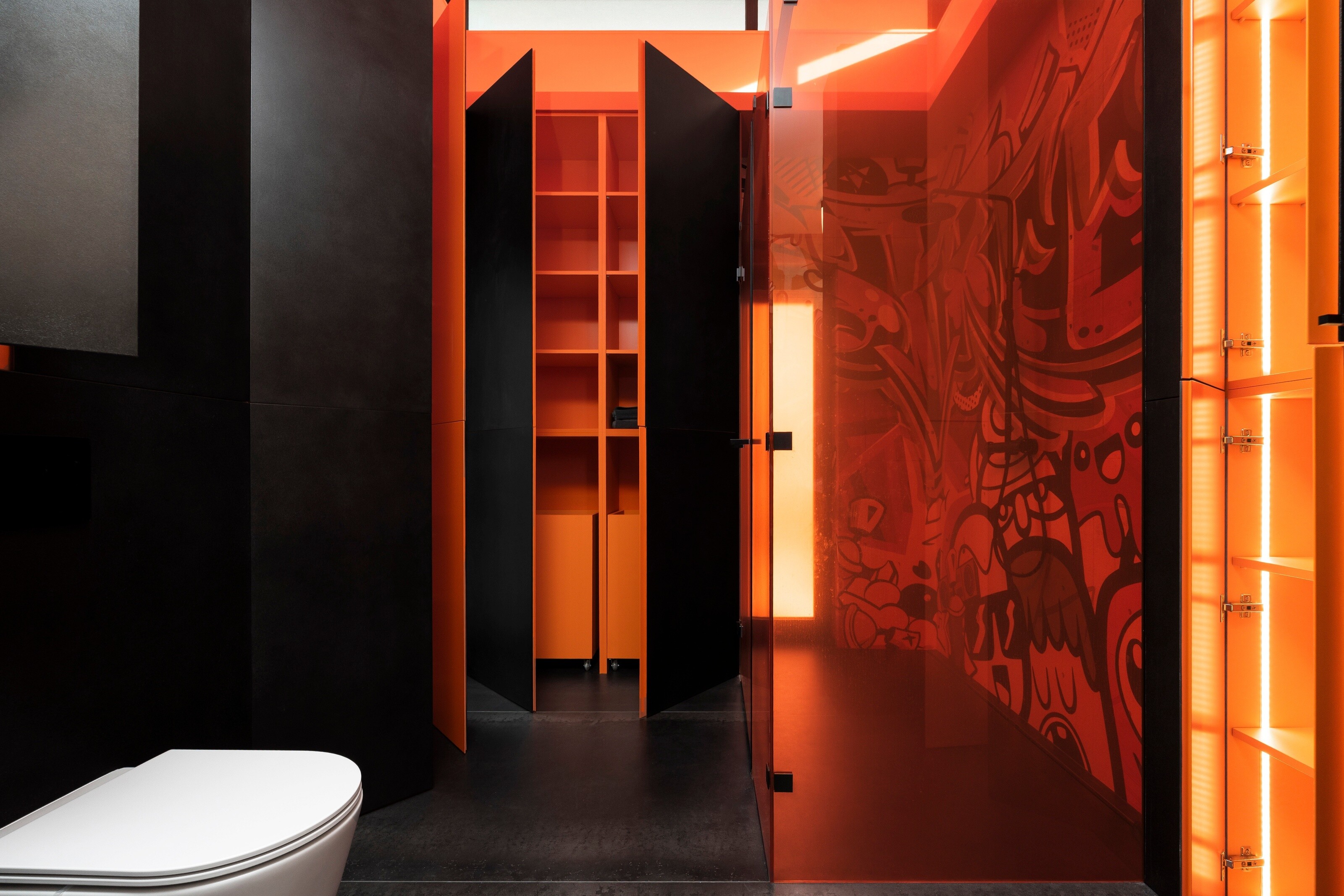 Nowoczesna łazienka z pomarańczową zabudową i artystyczną grafiką
